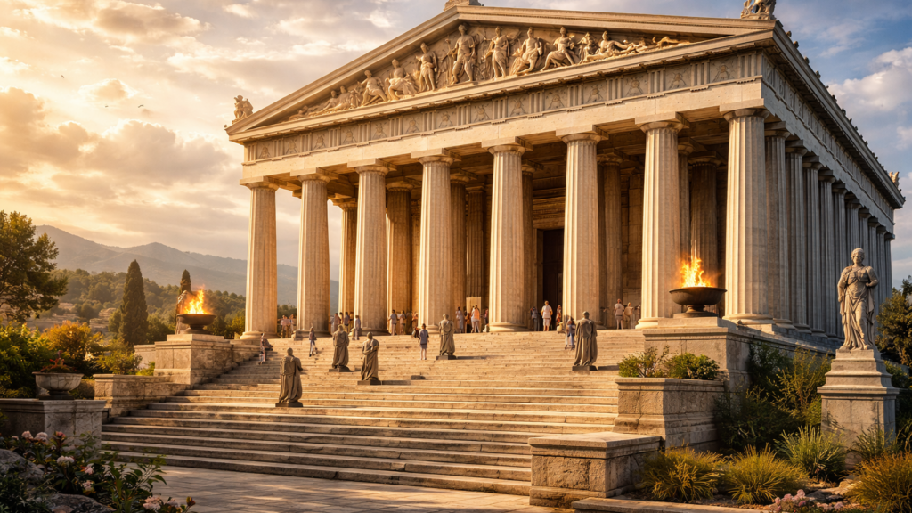 A ordem dórica é caracterizada por colunas robustas, sem base e com capitéis simples. A jônica apresenta colunas mais delgadas e elegantes, com capitéis decorados por volutas. Já a ordem coríntia distingue-se pela riqueza decorativa, com capitéis ornamentados por folhas de acanto. Um dos exemplos mais famosos da arquitetura grega é o Partenon, templo construído na Acrópole de Atenas entre 447 e 438 a.C., dedicado à deusa Atena. Essa construção representa um dos maiores símbolos da busca grega por harmonia e perfeição estética.