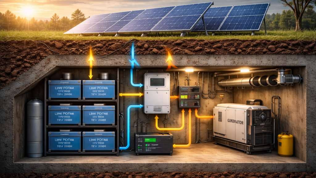 Quando todos esses elementos são integrados corretamente — banco de baterias, geração solar, inversores eficientes e geradores de backup — o resultado é um sistema energético altamente resiliente. Essa abordagem, amplamente utilizada em sistemas off-grid nos Estados Unidos, permite manter um bunker funcional por longos períodos, garantindo que iluminação, ventilação, comunicação e equipamentos essenciais permaneçam operacionais mesmo em situações de isolamento ou interrupção prolongada da rede elétrica.