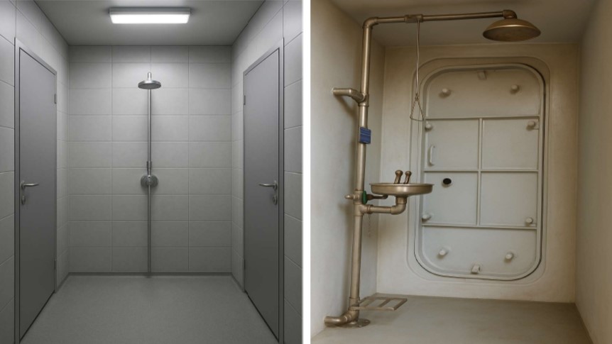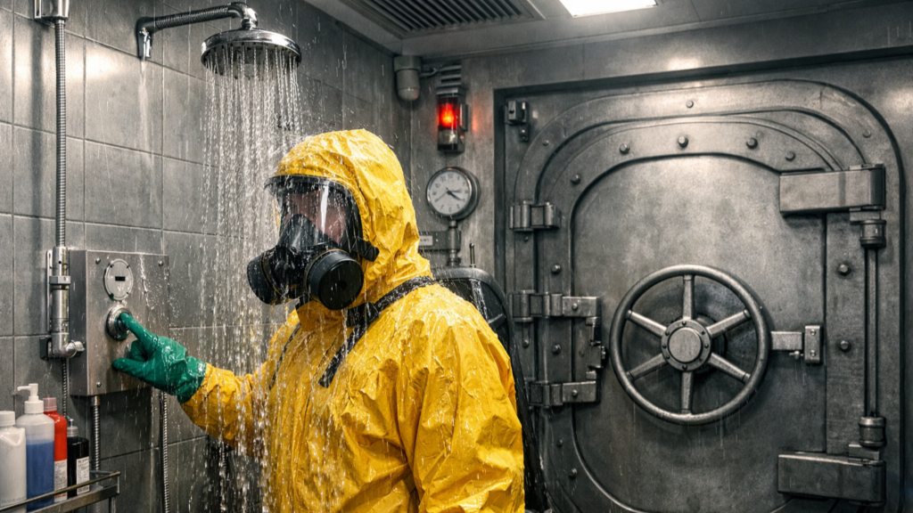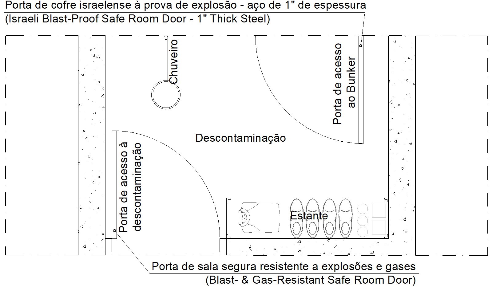 A necessidade desse tipo de espaço se torna evidente quando consideramos cenários de risco real. Durante emergências químicas ou biológicas, partículas contaminantes podem aderir à roupa, à pele ou aos equipamentos transportados. Sem um espaço de descontaminação, essas partículas poderiam ser levadas diretamente para o interior do abrigo, comprometendo a segurança de todos os ocupantes.