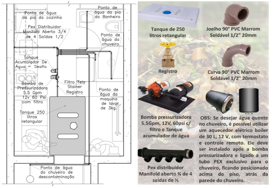 A circulação da água dentro do bunker depende de uma bomba pressurizadora elétrica. O sistema utilizado no projeto é uma bomba 12V com capacidade de 5,5 GPM (galões por minuto) e pressão de até 60 PSI, características semelhantes às utilizadas em sistemas hidráulicos de embarcações.