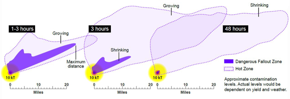A extensão da DRZ varia significativamente de acordo com a direção do vento e a intensidade da explosão. Em muitos cenários simulados, essa zona se alonga na direção dos ventos predominantes, formando uma espécie de “pluma radioativa” que pode atingir dezenas de quilômetros. Nas primeiras horas após a detonação — especialmente entre 1 e 2 horas — a intensidade da radiação é extremamente elevada, tornando praticamente impossível a sobrevivência sem proteção adequada.